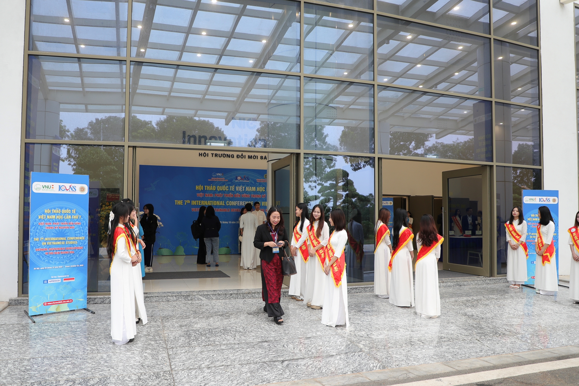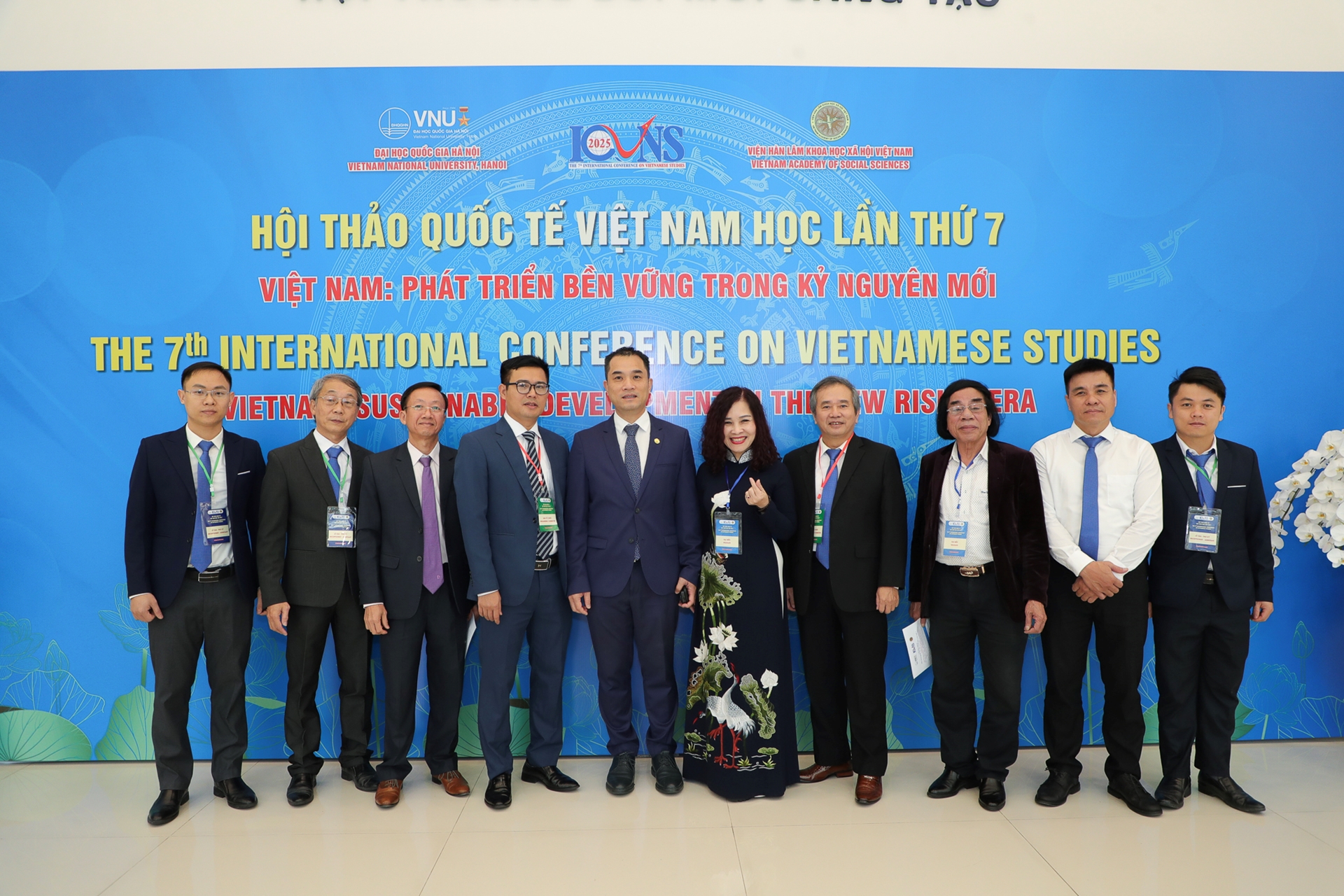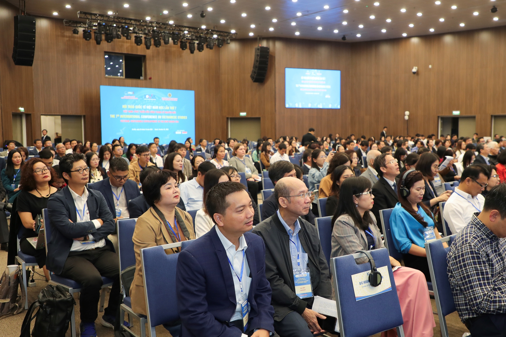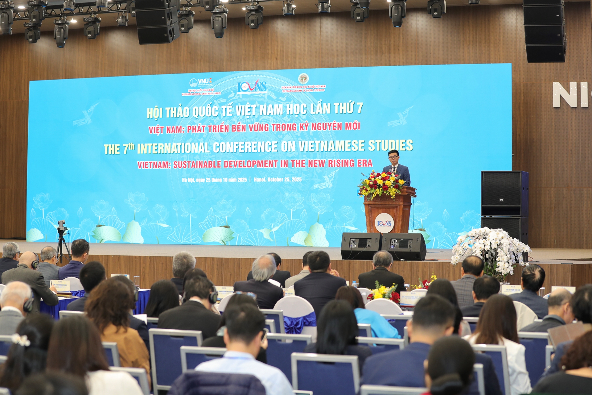 Trình bày báo cáo đề dẫn tại phiên khai mạc, TS. Phạm Đức Anh, Viện trưởng Viện Việt Nam học và Khoa học phát triển ĐHQGHN cho biết, Hội thảo Quốc tế Việt Nam học lần thứ 7 là diễn đàn khoa học liên ngành quy mô toàn cầu, quy tụ các học giả, chuyên gia và nhà hoạch định chính sách trong nước và quốc tế nhằm tổng kết, chia sẻ những kết quả nghiên cứu, đào tạo và ứng dụng thực tiễn về Việt Nam trong bối cảnh toàn cầu hóa, chuyển đổi số và phát triển bền vững. Sự kiện không chỉ mang ý nghĩa học thuật mà còn là diễn đàn tư tưởng và chính sách quan trọng, góp phần hiện thực hóa các mục tiêu phát triển đất nước đến năm 2045, kỷ niệm 40 năm công cuộc đổi mới và khẳng định vị thế của Việt Nam trong bản đồ tri thức nhân loại.