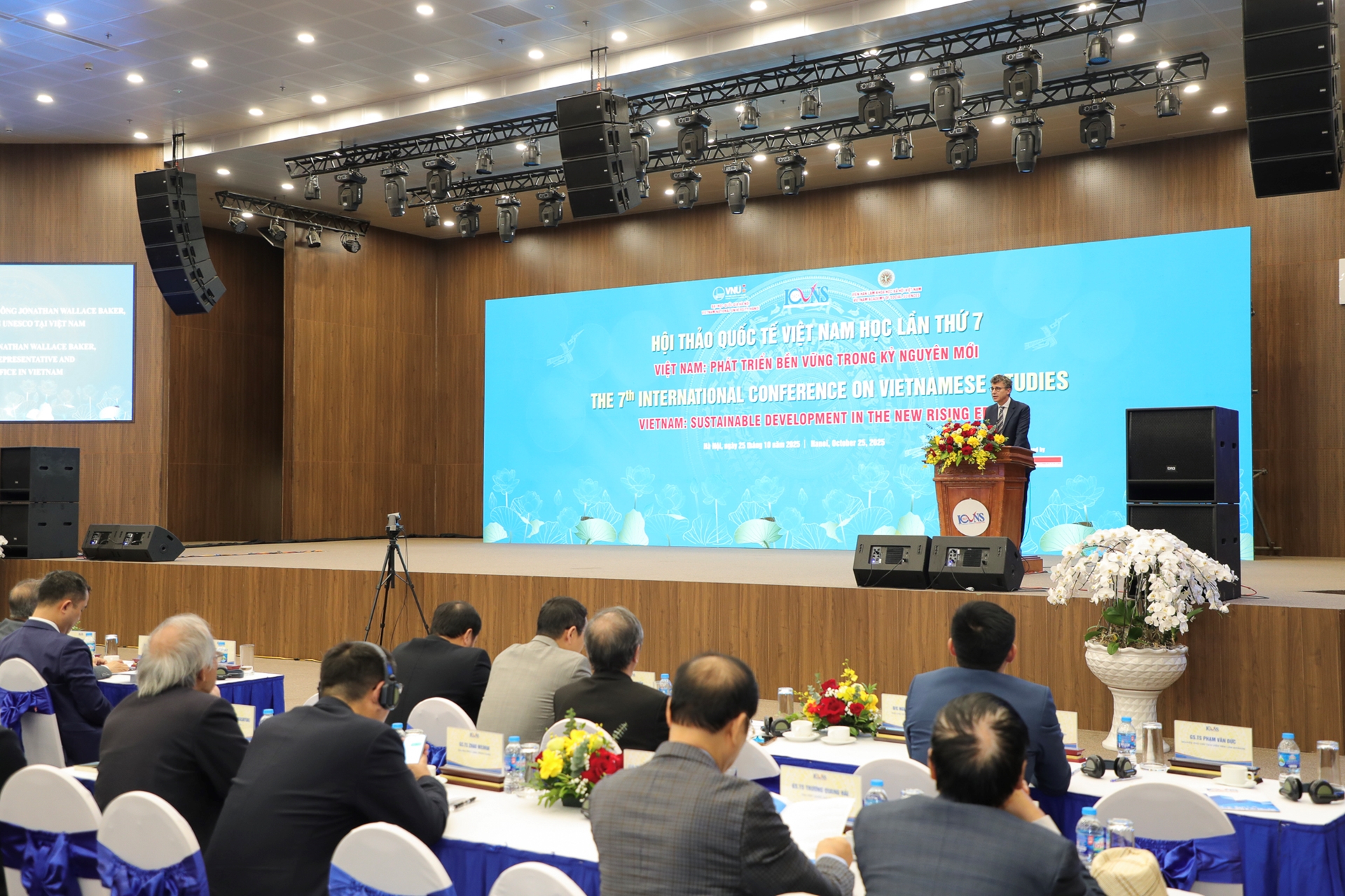 Trưởng đại diện UNESCO tại Việt Nam, ông Jonathan Wallace Baker bày tỏ vui mừng khi tham dự Hội thảo quốc tế Việt Nam học – diễn đàn học thuật quy mô, quy tụ đông đảo học giả và chuyên gia trong nước, quốc tế. Ông đánh giá cao các công trình nghiên cứu được trình bày tại Hội thảo, coi đây là nguồn tri thức có giá trị cho hoạch định chính sách, phát triển xã hội bền vững và củng cố hệ sinh thái đổi mới sáng tạo của Việt Nam. Đại diện UNESCO nhấn mạnh, Hội thảo là dịp quan trọng để tăng cường kết nối giữa nghiên cứu và chính sách, giữa tri thức và hành động trong phát triển quốc gia.