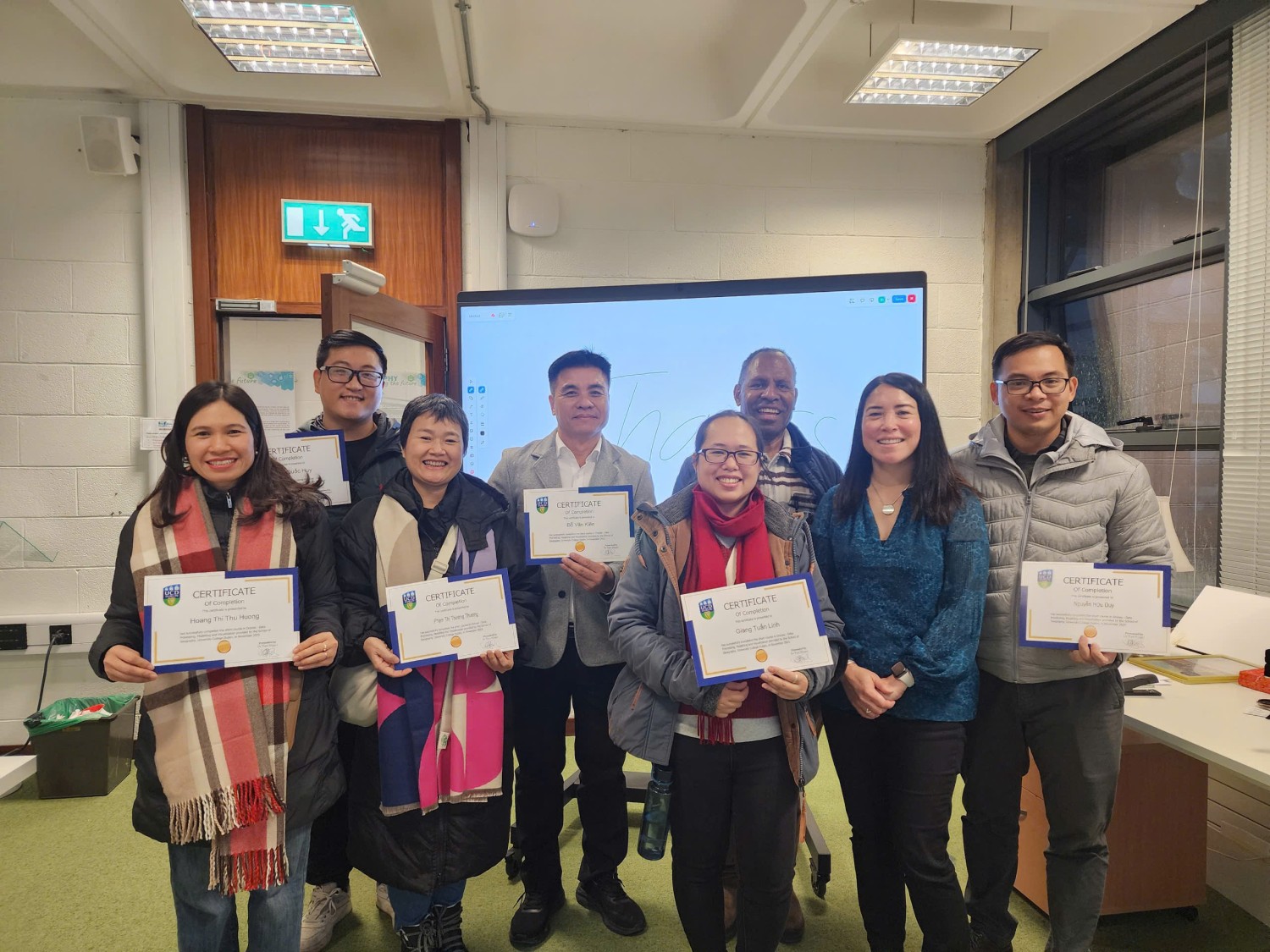 Kết thúc chương trình làm việc tại Dublin, đại diện Trường Địa lý, Đại học University College Dublin đã trao các chứng nhận hoàn thành khóa bồi dưỡng chuyên môn về “Drones – Data Processing, Modelling and Visualization” cho các thành viên trong đoàn công tác. Đây là hoạt động ghi nhận nỗ lực học thuật và sự tham gia tích cực của đoàn trong chuỗi tập huấn chuyên sâu thuộc khuôn khổ dự án EDU/2024 – IVIDES. Việc trao chứng nhận không chỉ đánh dấu kết quả cụ thể của quá trình hợp tác mà còn tạo nền tảng để các học giả của hai bên tiếp tục mở rộng năng lực công nghệ địa không gian, phục vụ triển khai giai đoạn tiếp theo của dự án và các hướng nghiên cứu chung trong tương lai.